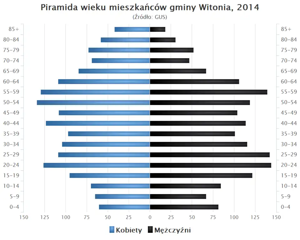 - Piramida wieku mieszkańców gminy Witonia w 2014 roku[1].