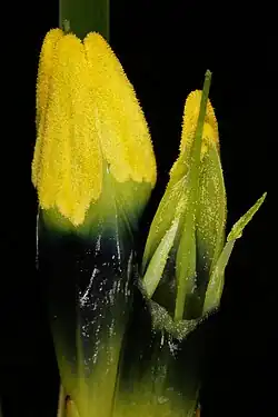 - Kwiaty zebrane w pseudowiechę z krótkimi bocznymi odgałęzieniami. Poszczególne kwiaty ułożone w parach w od 4 do 8 dwurzędek, wyrastających na krótkiej szypułce, wspartych od 3 do 5 dużymi i łykowatymi podsadkami o długości 3,5 cm. Kwiaty siedzące, promieniste, rurkowate. Listki okwiatu w dolnej części zrośnięte w rurkę o długości 50–55 mm, która w dolnej połowie jest wąskocylindryczna, o szerokości 3 mm, bladozielona i otoczona przez podsadki, wypełniona nektarem, a powyżej szersza, o szerokości 6 mm, ciemnozielona do czarniawej; w górnej części wolne, pazurkowate, lancetowate, o długości ok. 2,5 cm, w dolnej połowie czarniawe, zewnętrzne w górnej połowie gęsto omszone i żółte, wewnętrzne zakryte przez zewnętrzne i bladozielone, jedynie wierzchołkowo odsłonięte, żółte i omszone. Nitki pręcików o długości ok. 10 mm, osadzone u nasady zewnętrznych listków okwiatu, płaskie i szerokie u nasady, zaostrzające się wierzchołkowo. Główki pręcików podługowato-równowąskie, o długości 56 mm, przylegające do wewnętrznej powierzchni zewnętrznych listków okwiatu, żółte. Pyłek żółty. Zalążnia mniej więcej kulista, o długości 2,5 mm, zwykle dwuzalążkowa w każdej komorze. Szyjka słupka nitkowata, wyrastająca na 2–3 mm powyżej okwiatu, bardzo drobno trójsieczna, łatki o długości 0,5 mm[5].
