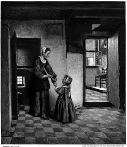 Podobne wnętrza o nieskazitelnym porządku widoczne są na wielu innych obrazach malarza, m.in. płótnach Kobieta z dzieckiem i małą dziewczynką (1658) czy Spiżarnia (1659), Rijksmuseum Amsterdam. Panujący ład podkreślony jest na nich rytmem płytek na posadzce, a kontrast stanowi matka częstująca swoją córkę piwem.