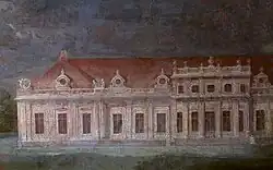 Na tyłach pałacu znajdował się rozległy, założony na trzech tarasach parterowy ogród z czterema fontannami i teatrem ogrodowym po południowej stronie. Po stronie północnej znajdował się ogród warzywny z oranżerią, cieplarnią, a także figarnią i mieszkaniem ogrodnika. W dalszej części ogrodu usytuowano kanał obiegający dwie regularne wyspy i wspomniany wyżej Wielki Kanał z kaskadą oraz dwoma owalnymi basenami – w środku jego długości i na zakończeniu[5]. Północną stronę kanału zajmował poprzecinany alejami las z salonem oraz położony na zachód od niego sad. Pomiędzy lasem a leżącym dalej na północ stawem założony został rozległy zwierzyniec jeleni. Teren na południe od Wielkiego Kanału przeznaczono pod menażerię. Przypuszczalnie ogród zaprojektował Pierre Ricaud de Tirregaille.