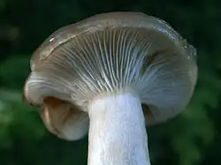 Grube i rzadko ustawione, nieco zbiegające na trzon. Początkowo są białe, potem siwe[6].