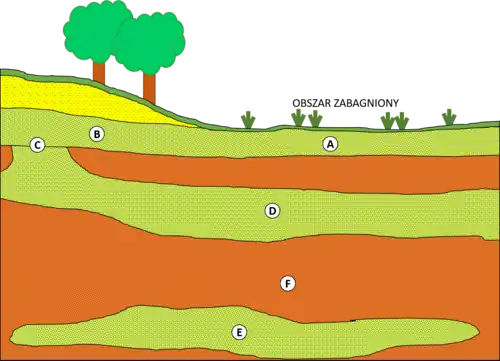 - wody przypowierzchniowe (błędnie nazywane zaskórnymi) – występują na bardzo małych głębokościach, strefa aeracji jest niewielka lub czasem nie istnieje, a zwierciadło styka się z powierzchnią. Są one wrażliwe na warunki pogodowe i silnie zanieczyszczoneStrefa wzniosu kapilarnego[25][26][27].