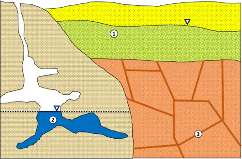 - wody krasowe – wypełniają próżnie w skałach powstałe w wyniku procesów krasowych[45][43][46]. Wypełniają też kanały i kawerny powstające w wyniku ługowania wapieni, dolomitów, gipsów oraz halitu. Od wód szczelinowych różnią się wielkością próżni, w których występują. Są zasilane bezpośrednio lub pośrednio przez opady atmosferyczne lub wody powierzchniowe. Zasilanie wód krasowych jest intensywne. Zwierciadło wód krasowych zależy od zasilania opadowego i nie wykazuje związku z ukształtowaniem powierzchni. Krążenie wód w obszarach krasowych jest zależne zarówno od budowy geologicznej, jak i geomorfologii. W układzie krążenia wód krasowych wyróżnia się ruch pionowy, zasilający i poziomy wyprowadzający wody krasowe na powierzchnię często w postaci wywierzysk[41].