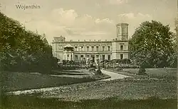 - Piętrowy pałac wybudowany w XIX w. Od frontu ryzalit z głównym wejściem. Po lewej stronie sześcioboczna trzypiętrowa wieża, natomiast po prawej czworoboczna i dwupiętrowa. Obiekt był częścią rozległego założenia pałacowo-parkowego. Jego założenia uległy zniszczeniu. Zachowały się ruiny kaplicy grobowej, położonej na wyspie nieistniejącego dziś śródleśnego jeziora[3].