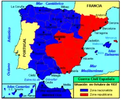 Hiszpańska wojna domowa (hiszp. Guerra civil española lub guerra de España) – wojna domowa pomiędzy rządem Republiki Hiszpańskiej, wyłonionym przez koalicję Frontu Ludowego i wspierającymi go siłami (liberałami, republikanami, socjalistami, Baskami, Katalończykami, komunistami i anarchistami) a prawicową opozycją (nacjonalistami, faszystami, monarchistami i konserwatystami[1][2][3][4][5]), która toczyła się w Hiszpanii w latach 1936–1939. Traktowana przez mocarstwa europejskie jako poligon do testowania nowych rodzajów broni w warunkach bojowych[6].