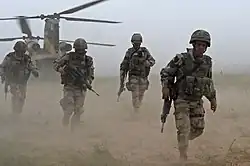 ![]() Zgodnie z ruchem wskazówek zegara od lewego górnego rogu: amerykańskie F-15E Strike Eagle z 336. Eskadry Myśliwców Ekspedycyjnych zrzucają 908-kilogramowe bomby na jaskinię we wschodnim Afganistanie, 2009 r.; amerykańscy żołnierze z 2. batalionu 327 Pułku Piechoty 101 Dywizji Powietrznodesantowej w czasie wymiany ognia z siłami talibów w prowincji Kunar, 2011 r.,; żołnierz Afgańskiej Armii Narodowej przeprowadzający obserwację z dachu Humvee, 2010 r.; żołnierze afgańscy i amerykańscy brodzą w śniegu na patrolu w prowincji Logar, 2011 r.; zdobyty przez talibów Humvee w Kabulu, 2021 r.; afgański żołnierz rozpoznający dolinę w prowincji Parwan, 2014 r.; brytyjskie wojska przygotowujące się do wejścia na pokład śmigłowca Chinook podczas operacji Czarny Książę, 2010 r. | |||