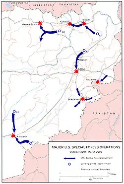 Na początku listopada 2001 przeciwko talibom użyto bomby konwencjonalnej BLU-82 oraz samolotów szturmowych Lockheed AC-130. 2 listopada 2001 defensywa talibska została zniszczona, co umożliwiło wojskom Sojuszu Północnego marsz na Kabul. Podczas gdy zdobywano Mazar-i-Szarif na północy kraju i odcinano drogę do stolicy, ekstremiści z Al-Ka’idy brali odpowiedzialność za ochronę afgańskich miast pod administracją talibską, co ukazało brak stabilności rządu talibów. W czasie kiedy Sojusz Północny zdobywał kontrolę nad kolejnymi miastami, USA czyniło starania na rzecz odnalezienia Usamy ibn Ladina.