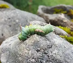 Podstawowa barwa ciała gąsienicy jest w pierwszy stadium czarnobrązowa. Późniejsze stadia są coraz jaśniejsze. Ostatnie stadium ma tło zielone, a na nim różowe plamki[2].