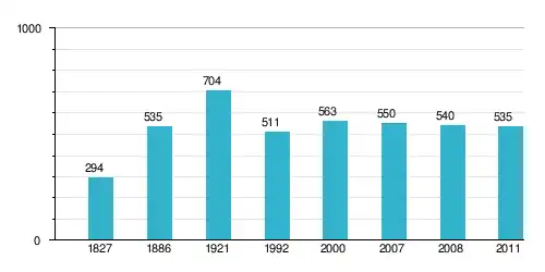 W roku 1992 mieszkało tu 511 osób, było 119 zagród i 744,59 ha gruntów. W czasie spisu powszechnego w 2011 r. naliczono 535 mieszkańców.