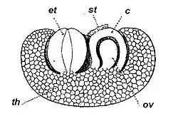 - Z uwagi na skuteczność rozmnażania wegetatywnego rośliny rzadko kwitną. Pojedynczy kwiat obupłciowy[16] (według innych autorów kwiatostan składający się z 1 kwiatu żeńskiego i 1 kwiatu męskiego)[8], powstaje centralnie na górnej powierzchni plechy i pozbawiony jest błoniastej pochwy[7]. Kwiat składa się z pojedynczego słupka w dole z jednokomorową, kulistą zalążnią, zawierającą jeden ortotropowy zalążek. Słupek zakończony jest wklęsłym znamieniem osadzonym na bardzo krótkiej szyjce[8]. Obok słupka znajduje się pojedynczy, jednokomorowy[16] pylnik (według niektórych autorów 2-komorowy[17]), otwierający się na szczycie wzdłuż pigmentowanej linii[16].