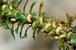 - Nerkowate, otwierające się dwiema klapami, rozwijają się w kątach liści zarodnionośnych (sporofili), które nie różnią się lub są tylko nieco mniejsze od zwykłych liści asymilacyjnych (trofofili). Sporofile skupione są w szczytowej części pędu lub występują odcinkami na różnej jego długości i wysokości. Sporofile u części przedstawicieli są niezbyt odmienne od płonnych liści asymilacyjnych lub wyraźnie od nich mniejsze[7][4]. Zarodniki jednakowe (jak u innych widłakowatych), tetradryczne, z wewnętrznymi ścianami wklęsłymi i wyraźnymi krawędziami[4].