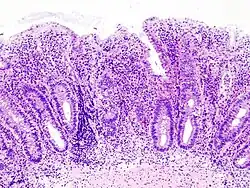 - immunologiczne – wzmożona aktywacja limfocytów T CD4+. Wytwarzają one większe ilości cytokin, od których zależy dalszy przebieg odpowiedzi immunologicznej. Dominuje subpopulacja limfocytów Th2, produkujących interleukiny (IL) 4, 5, 6, 10 (odpowiadają za typ humoralny odpowiedzi ze zwiększoną syntezą przeciwciał). Szczególnie niekorzystny wpływ mają cytokiny prozapalne – TNF-α, IL-1β, IL-8, IL-12. W colitis ulcerosa są one w przewadze nad cytokinami o działaniu przeciwzapalnym – IL-1ra, IL-4, IL-10, IL13. Innymi mediatorami zapalenia w jelitach są leukotrieny (zwłaszcza leukotrien B4), czynnik aktywujący płytki (PAF) oraz rodniki tlenowe. Wszystkie one podtrzymują proces zapalny.