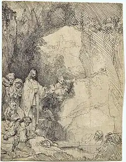 W 1632 roku Rembrandt stworzył akwafortę, podejmując ponownie temat wskrzeszenia Łazarza. Wzorował się na swoim obrazie z 1630 roku, choć bije z niej więcej ekspresji. Kompozycja akwaforty, dość teatralna, wskazywała na jeszcze większy wpływ baroku, a przede wszystkim sztuki kontrreformacji. Chrystus jako cudotwórca stoi tyłem do widza z podniesioną dłonią, z drugą ręką wspartą na biodrze. Jego gest przypomina rzucanie zaklęcia przez czarnoksiężnika. Świadkowie cudu są przerażeni i jednocześnie zaskoczeni. Ich gesty są pełne dynamiki.