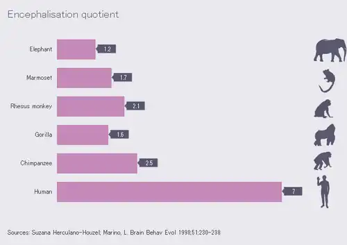 Współczynnik encefalizacji (EQ – ang. encephalization quotient), współczynnik umózgowienia – termin, który wprowadził Harry J. Jerison[11] w celu oszacowania potencjalnych możliwości intelektualnych mózgu danego organizmu. Wskazuje ile razy większy lub mniejszy jest przeciętny mózg osobnika danego gatunku od mózgu, jakiego należy się spodziewać u zwierzęcia o rozmiarach typowych dla tego gatunku. Współczynnik encefalizacji obliczany jest różnymi metodami porównania masy mózgu do masy ciała, np. według swojej pierwotnej koncepcji Jerison zaproponował wzór: