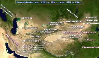 - ↑ Y.A. Zadneprovskiy: The nomads of nothern Central Asia after the invasion of Alexander. W: János Harmatta (ed.), B.N. Puri (ed.), G.F. Etemadi (ed.): History of Civilizations of Central Asia. Vol. II. The Developement of Sedentary and Nomadic Civilizations: 700 B.C. to A.D. 250. Paris: Unesco Publishing, 1999, s. 461. ISBN 978-92-3-102846-5.; Yü Ying-Shih: Han foreign relations. W: Denis Crispin Twitchett, Michael Loewe: The Ch'in and Han Empires, 221 B. C.-A. D. 220. Cambridge: Cambridge University Press, 1986, s. 444. ISBN 0-521-24327-0.