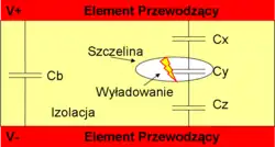 Model dielektryka zawierającego szczelinę może być przedstawiony jako pojemnościowy dzielnik napięciowy zrównoleglony pojemnością kabla (patrz rysunek obok). Kondensator Cx reprezentuje pojemność pomiędzy elementem przewodzącym V+ a górną powierzchnią szczeliny powietrznej. Kondensator Cy jest pojemnością szczeliny powietrznej, podczas gdy Cz to pojemność izolacji, gdzie jedną elektrodą jest dolna powierzchnia szczeliny, a drugą element przewodzący V-. Równoległy kondensator Cb reprezentuje pozostałą pojemność kabla.