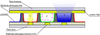 Mieszanina gazów jest zamknięta w komorach. Trzy umieszczone obok siebie komory, każda z luminoforem dla innej składowej barwy (czerwona, zielona, niebieska), tworzą jeden piksel zdolny świecić różnymi kolorami, stanowiącymi złożenie trzech składowych (synteza addytywna).