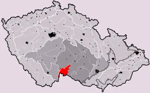 Graniczy na zachodzie z Kotliną Trzebońską (czes. Třeboňská pánev), na północnym zachodzie z Wyżyną Krzemesznicką (czes. Křemešnická vrchovina), na wschodzie z Wyżyną Krzyżanowską (czes. Křižanovská vrchovina).
