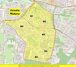 Wyżyny podzielone są na 6 obszarów nazwane od B1 do B6, z czego Wyżyny B6 zaliczane są do jednostki urbanistycznej Glinki. Numeracja oznacza kolejność powstawania kolejnych części osiedla.