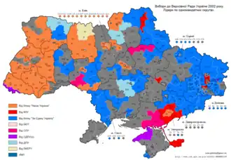 | Blok Wyborczy Partii Politycznych Nasza Ukraina | 23,57% | 70 | 42 | 112 |