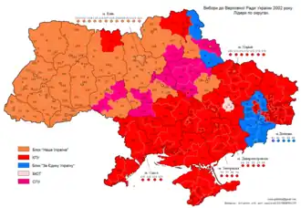 - Za Jedyną Ukrainę, liderzy: Wołodymyr Łytwyn, Anatolij Kinach, Dmytro Tabacznyk – koalicja ugrupowań rządowych, związana z klanami donieckim i dniepropietrowskim, tj.: