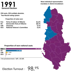 Albańska Partia Pracy zdobyła 149 mandatów w Zgromadzeniu (wraz ze sprzymierzonymi stowarzyszeniami - 169). W 13 okręgach wyborczych APP zdobyła wszystkie mandaty (Fier, Gramsh, Kolonja, Kukës, Librazhd, Mat, Mirdita, Permet, Pogradec, Puka, Skrapar, Tepelena, Tropoja)[2]. Demokratyczna Partia Albanii uzyskała 75 mandatów, wygrywając wybory w Durrësie, Szkodrze i Tiranie. Pięć mandatów przypadło organizacji Omonia, reprezentującej mniejszość grecką, jeden mandat zdobył deputowany niezależny[2]. W gronie 250 deputowanych znalazło się 9 kobiet. Największą grupę zawodową wśród deputowanych stanowili przedstawiciele zawodów rolniczych (agronomowie i weterynarze) - 62 osoby. Aż 226 deputowanych było parlamentarnymi nowicjuszami.