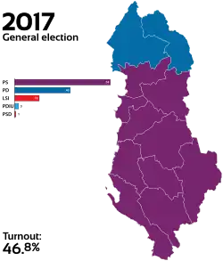 - ↑ Zgjedhjet 2017 – Përfundon numërimi: PS 74 mandate, PD 43, LSI 19, PDIU 3, PSD 1. Idrizi jashtë = 2017-06-28 [online], oranews.tv, 27 czerwca 2017 [zarchiwizowane z adresu 2017-10-14] (alb.).