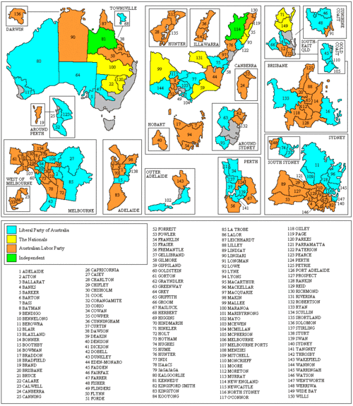 Barwy partyjne zmieniło 26 ze 149 dotychczasowych jednomandatowych okręgów wyborczych do Izby Reprezentantów. W 22 przypadkach przeszły one z rąk LPA do ALP, w dwóch w przeciwnym kierunku. Dwa mandaty na rzecz ALP straciła również NPA. Na wyborczej mapie Australii zadebiutował też nowy okręg wyborczy Flynn w stanie Queensland, zaś jego pierwszym reprezentantem został Chris Trevor z NPA.