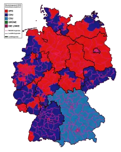 Według wstępnych wyników oficjalnych najwięcej głosów zdobyła opozycyjna CDU/CSU (ok. 35,2%), zaś współrządząca SPD ok. 34,2%. Żadna z tych partii nie była w stanie stworzyć większościowego rządu ze swoim tradycyjnym partnerem politycznym (odpowiednio FDP 9,8% i Grüne 8,1%). Do parlamentu weszła też lewicowa Die Linkspartei. (8,7%). Możliwość koalicji z dotychczas rządzącymi SPD i Zielonymi wykluczyła liberalna FDP (Koalicja sygnalizacji świetlnej), natomiast SPD wykluczyła koalicję rządową z Die Linkspartei. Jedną z możliwości był sojusz CDU/CSU z FDP oraz Partią Zielonych (Koalicja jamajska), wykluczony jednak przez tych ostatnich. Realna stała się Wielka koalicja CDU/CSU-SPD. Głównym problemem w rozmowach pomiędzy partiami było stanowisko kanclerza, gdyż ubiegali się o nie zarówno Merkel, jak i Schröder. Ostatecznie 9 października 2005 uzgodniono, że kanclerzem zostanie Angela Merkel.