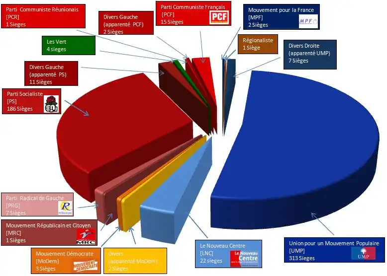 Ostatecznie UMP zdobyła łącznie 313 miejsc w Zgromadzeniu, jej koalicjanci z Nowego Centrum – 22, eurosceptyczny Ruch dla Francji – 2, niezależni kandydaci prawicy - 8. PS uzyskała 186 miejsc, Zieloni – 4 mandaty, Francuska Partia Komunistyczna – 15, Lewicowa Partia Radykalna – 9, niezależni kandydaci lewicy - 13. Nowe ugrupowanie François Bayrou, MoDem posiadać będzie 3 deputowanych, zaś 2 mandaty przypadły kandydatom regionalnych partii z terytoriów zależnych.