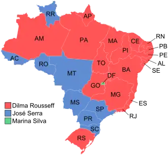 - ↑ RESULTADO DAS ELEIÇÕES: BRASIL – SEGUNDO TURNO. divulgacao.tse.gov.br – Eleicoes 2010. [dostęp 2010-11-08]. (port.).