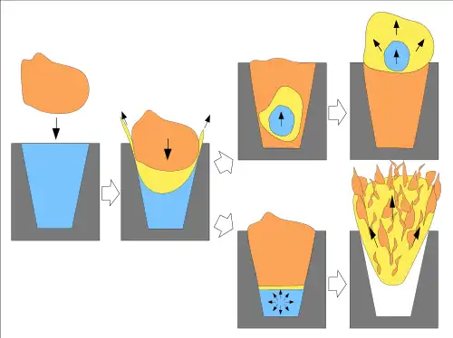 Zjawiska podobne do powszechnie znanych efektów kontaktu gorącego tłuszczu z wodą zachodzą też na granicach między wodą i innymi gorącymi materiałami (np. stopione metale, magma)[f]. Są przykładem zjawisk nazywanych ogólnie „eksplozjami cieplnymi”[g], zachodzącymi na granicy między cieczą gorącą (nazywaną „paliwem”) i bardziej lotną cieczą zimną (nazywaną „chłodziwem”). W badanych układach temperatura paliwa jest wyższa od temperatury wrzenia chłodziwa[38][16]. Gdy rozdrobnione cząstki chłodziwa zostają wprowadzone do paliwa, niemal natychmiast jest osiągany stan nadkrytyczny; równowaga takiego układu jest chwiejna – łatwo dochodzi do gwałtownego rozprężania chłodziwa, połączonego z wykonywaniem pracy użytecznej[15].