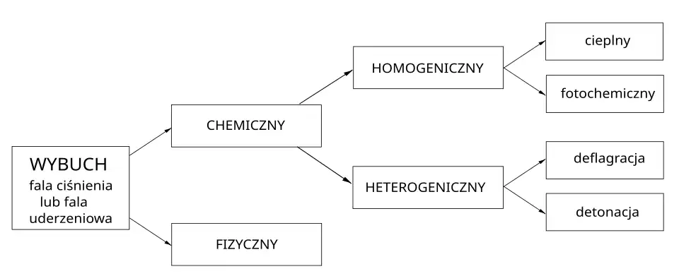 Wybuch powoduje powstanie fali podwyższonego ciśnienia. W zależności od prędkości rozchodzenia się tej fali wyróżnia się m.in. deflagrację (zwaną też „wybuchem właściwym”[3]), detonację (fala podwyższonego ciśnienia nazywana falą uderzeniową) lub eksplozję; pojęcie „eksplozja” bywa też uznawane za synonim „wybuchu”[1][10]. Przeciwieństwem eksplozji jest implozja[11].