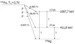 Izotop 198Au jest beta-emiterem rozpadającym się na izotop rtęci 198Hg. W procesie tym liczba atomowa (liczba protonów w jądrze) wzrasta o 1.