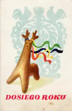Pocztówka noworoczna z byśkiem i wycinanką kurpiowską z Puszczy Zielonej, 1951