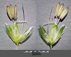 - Zebrane w kłoski długości 3 mm, te z kolei zebrane w wałkowatą, tępo ściętą na końcach wiechę grubości 4-7 mm. Plewy zrosłe w nasadzie, z rozchylonymi szczytami, owłosione lub orzęsione na grzbiecie. Plewka dolna oścista; ość dłuższa od niej, wystająca ponad kłosek o około 2 mm. Pylniki jasnożółte, po przekwitnieniu brunatne[5].