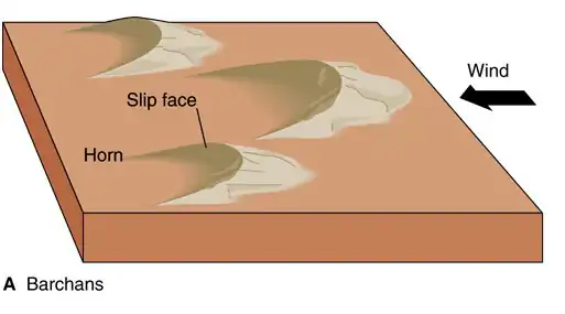 Do najbardziej spektakularnych i rozpoznawalnych elementów krajobrazu Mierzei Łebskiej, a zarazem całego Słowińskiego Parku Narodowego, należą wysokie, strome, sierpowate barchany – wydma Czołpińska (56 metrów wysokości) i położona na wschodzie Wydma Łącka (30 metrów wysokości)[1]. W części pola Wydmy Czołpińskiej zachodzą procesy charakterystyczne dla wydm ruchomych. Odsłonięty w obrębie barchanu materiał piaszczysty na stokach dowietrznych jest obsuwany przez wiatr w dół wydmy, w postaci strumieni i języków piaskowych. Poprzez stałe zwiewanie ziaren piasku na stokach dowietrznych i ich akumulację po stronie zawietrznej, następuje przemieszczanie się mas piaszczystych, zwanych wędrówką wydmy[2].