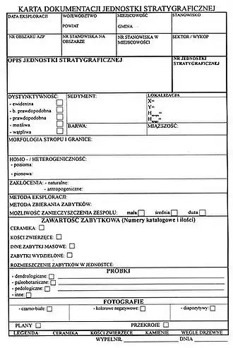 - Dokumentacja opisowa to wszelkiego rodzaju notatki, opisy i dzienniki polowe sporządzane przez archeologów w terenie. Współcześnie najczęściej dokumentację opisową sporządza się na uprzednio wydrukowanych zestandaryzowanych kartach opisu jednostek stratygraficznych.