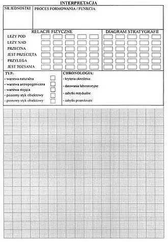 Wykopaliska archeologiczne polegają na identyfikowaniu granic (w płaszczyźnie poziomej i pionowej) kolejno zalegających coraz niżej jednostek stratygraficznych i ich eksploracji w kolejności odwrotnej do kolejności, w jakiej zostały kiedyś zdeponowane. Każda jednostka stratygraficzna reprezentuje jakiś epizod historii stanowiska archeologicznego. Jednostki stratygraficzne dzielą się na: