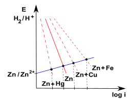 Szybkość korozji jest mniejsza, gdy większe jest nadnapięcie na jednej lub na obu elektrodach (większe nachylenie prostych). Ilustruje to przykład wpływu rtęci jako dodatku stopowego do cynku, na nadnapięcie wodoru na katodach korozyjnych (redukcja jonów H+). Działanie przeciwne mają dodatki miedzi lub żelaza, zwiększające szybkość korozji stopów cynku w kwasach[5].