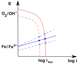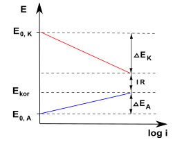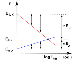 Zgodnie z równaniem Tafela, dotyczącym aktywacyjnej polaryzacji elektrod, w układzie – otrzymuje się linie proste, o ujemnym współczynniku nachylenia dla katody ogniwa korozyjnego i nachyleniu dodatnim dla anody. Proste przecinają się w punkcie, w którym potencjały obu elektrod są jednakowe ( „potencjał mieszany” powierzchni korodującego metalu). Odpowiadająca temu potencjałowi wartość gęstości prądu jest miarą maksymalnej szybkości korozji ( „prąd korozyjny”).