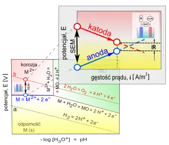 Elektrodami ogniw korozyjnych są fragmenty powierzchni metalu, na których zachodzi jego utlenianie (korozja elektrochemiczna) i redukcja depolaryzatora (np. jonów wodorowych lub cząsteczkowego tlenu). Wpływ polaryzacji tych elektrod na szybkość korozji jest przedstawiany na wykresach Evansa, które sporządza się w układzie współrzędnych: potencjał elektrody – logarytm z gęstości prądu [4][5].
