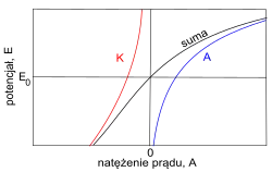 Potencjał anod jest większy, a potencjał katod – mniejszy od potencjału równowagowego o wartość nadpotencjału (nadnapięcia, ), spowodowanego polaryzacją elektrod: