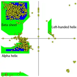 Niedozwolone są te wartości kątów φ-ψ, które powodują przestrzenną zawadę między niezwiązanymi z nimi atomami. Dozwolone kombinacje zaznacza się na wykresie kropkami.