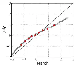 Jeżeli dwa porównywane rozkłady są podobne, punkty na wykresie Q-Q będą w leżeć w pobliżu linii y = x. Jeśli między rozkładami istnieje doskonała lub przybliżona zależność liniowa, punkty na wykresie Q-Q będą w przybliżeniu leżeć na linii prostej, ale niekoniecznie będzie to linia y = x.