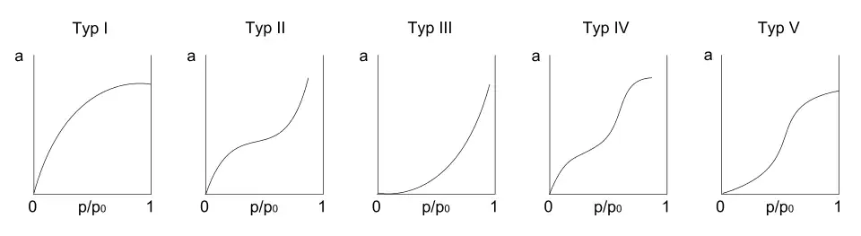 Według Brunauera izotermy adsorpcji par i gazów można podzielić na pięć zasadniczych typów. Krzywa typu I charakteryzuje adsorpcję chemiczną (chemisorpcję), krzywe typu II, III, IV i V – adsorpcję fizyczną. Na ogół chemisorpcji odpowiada początkowo stromy przebieg krzywej, która następnie ulega stopniowo spłaszczeniu. Przyjmuje się, że stromy odcinek krzywej odpowiada silnej tendencji powierzchni do wiązania cząsteczek gazowych, a płaska część krzywej – wysyceniu sił wiążących powierzchni. Adsorpcji fizycznej odpowiadają izotermy wykazujące rosnące nachylenie dodatnie przy wzroście ciśnienia gazu. Każdy kolejny przyrost względnego ciśnienia gazu powoduje większy przyrost ilości zaadsorbowanego gazu, aż do granicznej wartości ciśnienia równej prężności pary substancji adsorbowanej; przy tym ciśnieniu następuje kondensacja i izoterma adsorpcji przebiega pionowo w górę.