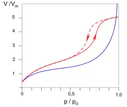 Histereza adsorpcji dotyczy izoterm adsorpcji zachodzącej na materiałach porowatych. Histerezę charakteryzuje inny przebieg izotermy adsorpcji (przy podwyższaniu ciśnienia adsorbatu) niż izotermy desorpcji (przy obniżaniu ciśnienia). Linia niebieska na wykresie obok obrazuje proces adsorpcji fizycznej zachodzącej na materiale nieporowatym. Linia czerwona ilustruje proces adsorpcji fizycznej zachodzącej na materiale porowatym. Czerwona linia przerywana ilustruje proces desorpcji.
