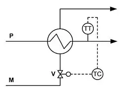 Sterowanie w tym układzie jest realizowane poprzez zmianę natężenia przepływu medium. W układzie takim czujnik temperatury TT zainstalowany jest na wylocie strumienia procesowego. Przekazuje on sygnał do kontrolera TC, który porównuje go z wartością zadaną. W przypadku odchyleń reguluje natężenie przepływu strumienia medium przy pomocy zaworu V.