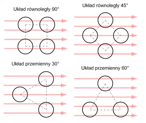 - rozmieszczenie rurek. Typ rozmieszczenia zwykle określa się, podając wartość kątów pomiędzy kierunkiem przepływu płynu na zewnątrz rurek a linią łączącą rurki. Typy rozmieszczenia 90° i 45° cechują się mniejszą intensywnością przenikania ciepła (w porównaniu z typami 30° i 60°). Inspekcja i czyszczenie w ich przypadku jest jednak łatwiejsze.