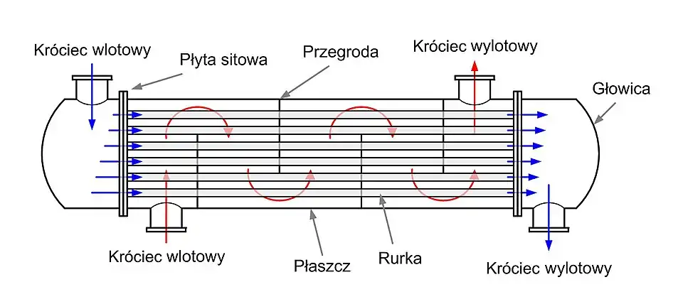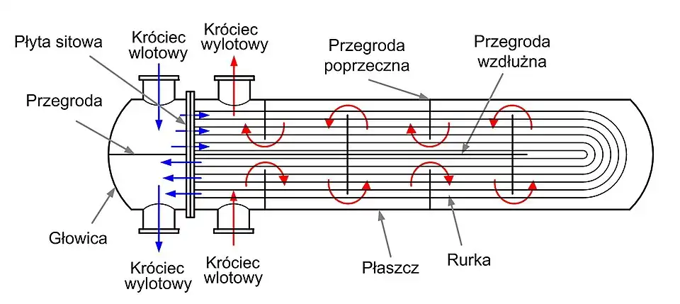 - liczba biegów (przepływowość). Większa liczba biegów zwiększa powierzchnię wymiany ciepła, nie wypływając na dynamikę przepływu płynów wewnątrz rurek (efekt identyczny z wydłużeniem rur). Dodanie biegów utrudnia jednak realizację przepływu burzliwego po stronie płaszcza i komplikuje mechanikę wymiennika, przez co staje się on trudniejszy do wykonania. Przeważnie stosuje się wymienniki jedno- lub dwubiegowe (niekiedy czterobiegowe). Wymienniki z rurkami giętymi są z założenia przynajmniej dwubiegowe. Rurki takie mogą wydłużać się pod wpływem ciepła, w trakcie pracy nie powodując naprężeń. Ich wadą jest ograniczona możliwość czyszczenia.